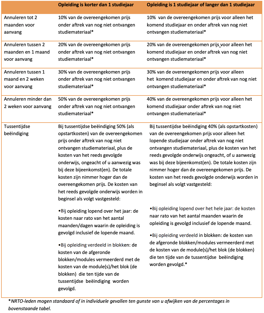 1. U kunt een voor bepaalde duur gesloten overeenkomst te allen tijde annuleren en opzeggen. De ondernemer doet u hiervan een bevestiging toekomen. Indien er sprake is van een overeenkomst inzake contactonderwijs met een vastgelegde startdatum geldt, na afloop van de eventuele bedenktijd, de volgende annuleringsregeling en tussentijdse beëindigingsregeling. U betaalt dan een redelijke vergoeding voor de reeds verrichte werkzaamheden waaronder de Opstartkosten. Voor alle duidelijkheid treft u hieronder een overzicht van deze kosten als percentage van de overeengekomen prijs. Deze percentages betreffen de maximaal te betalen vergoeding. Indien de te betalen redelijke vergoeding lager is dan zal u een lagere vergoeding in rekening worden gebracht. De hoogte van de vergoeding zal op uw verzoek door de ondernemer worden onderbouwd: